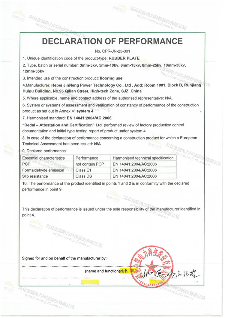 除了CE認證,金能電力的絕緣膠墊還通過了EN 14041:2004/AC2006標準中的甲醛釋放測試,獲得了E1級評級。這意味著我們產品在環保性能方面達到了歐標的最高級別,絕緣膠墊可直接鋪設于室內使用。